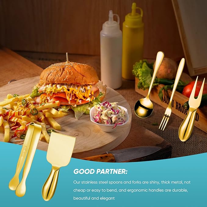 - Package includes: you will receive 4 pieces of butter spreader knives with stainless steel handle, 4 pieces of cheese spreader knives with stainless steel handle, 4 pieces of spoons, 4 pieces of forks, and 4 pieces of mini serving tongs, sufficient quantity and various styles to meet your needs in daily life