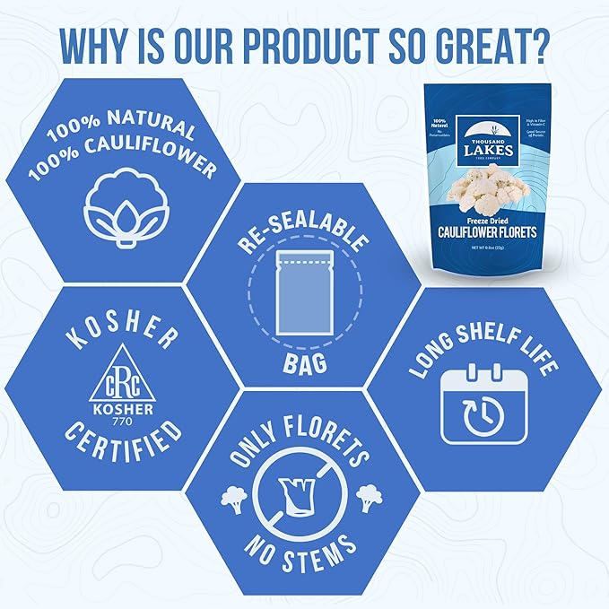 - Our 2-pack of .8 oz (1.6 oz total) resealable pouches of 100% Freeze Dried Cauliflower Florets do not have any additives (no added oil, sugar, salt, or other ingredients or preservatives). They're the perfect size for traveling or stocking up your pantry.