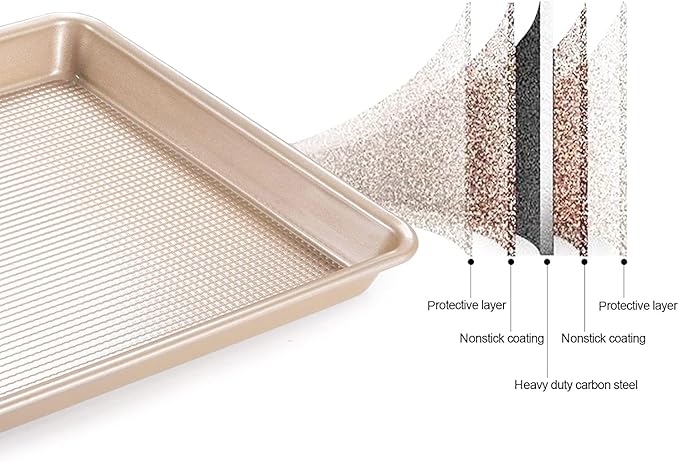 - Product Design: The cookie sheets nonstick set of 2 includes 1pc 17.7x12.8in large baking sheet and 1pc 14.7x10in cookie sheet. The cookie sheet set with a Micro-textured pattern inside the bottom improve airflow for evenly baking, 0.8mm thickness for more long-lasting. Perfect for home and commercial use.