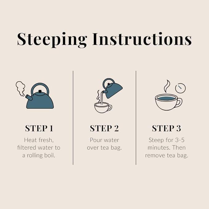 - STEEPING INSTRUCTIONS: Simply heat fresh, filtered water to a rolling boil. Then pour 6 oz of water over a tea bag and steep for 3-5 minutes. After steeping, add the used tea bags to compost or soil — they make gardens happy.