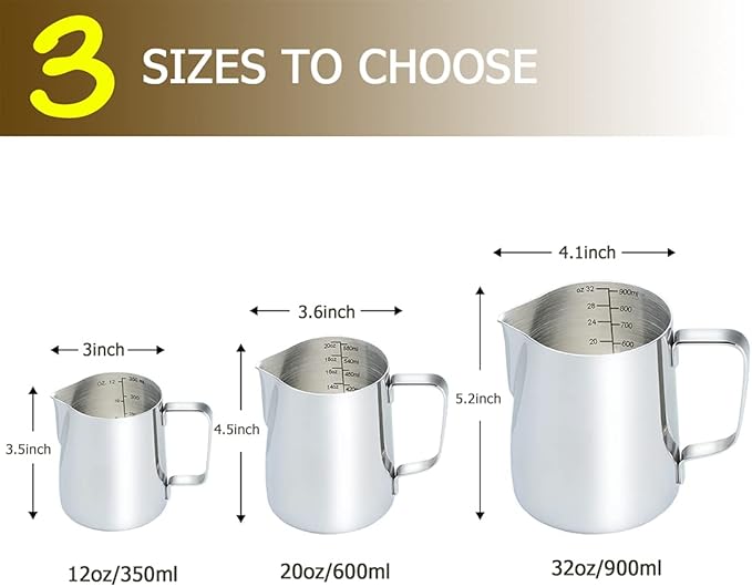 - For better drinks, Measurements on the Inside. We place U.S. and metric measurements up to 32 oz./900 mL right on the inside of our lovely Milk Frothing Jug. It is easy to read, you have to pay attention to the numbers for truly delicious drinks. Use with Espresso coffee Machines, to steam your milk or cream to be silky smooth with few bubbles, create perfect and personal latte art for your coffee or cappuccino.