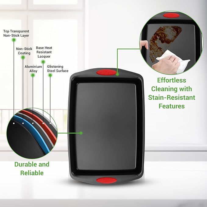 - HEATPROOF SILICONE HANDLES: The commercial grade restaurant quality kitchen bakeware features red silicone handles to prevent accidental burns. Also stain-resistant, easy to clean & dishwasher safe but hand washing is recommended to extend pan life