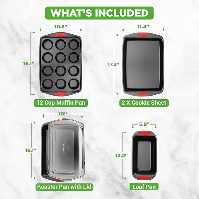 - 6-PIECE SET: The 6-Piece Baking Pan Set offers complete high-quality kitchenware for baking, sheet cakes, cookies, dinners, lasagna, and roasting vegetables. Includes 2 cookie sheets, 1 roaster pan w/ lid, 1 loaf pan & a 12-cup muffin pan