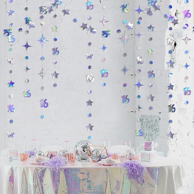 - 👍 Package includes - 4 strings of 11.5 feet/3.5 meters iridescent holographic number 16 sparkling twinkle star and circle dots garlands , totally is 46 feet/14 meters