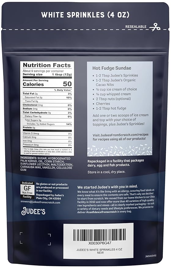 - Convenient And Allergy Conscious: Packaged in a resealable stand-up pouch, Judee's sprinkles are nut free and made with the highest quality ingredients. These white sprinkles cater to those with dietary restrictions, ensuring everyone can enjoy their sweet creations