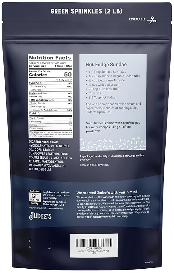 - Judee's Quality Sprinkles: Elevate your baked goods with Judee's Green Sprinkles, designed for vibrant decoration and perfect for any occasion. Ideal for those seeking gluten-free and nut-free options, each sprinkle enhances your desserts with a delightful texture