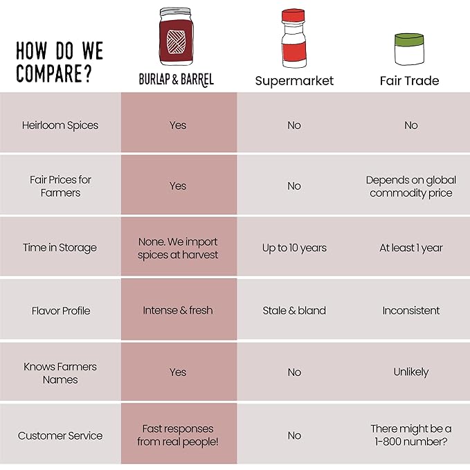 - Single Origin - Burlap & Barrel partners directly with small farms to source incredibly flavorful single-origin spices. Our spices are sourced directly from small farms around the world. They are harvested by hand, dried naturally, grown sustainably whenever possible, and transported directly to preserve freshness.