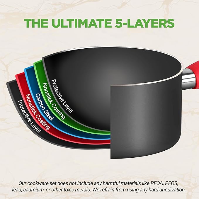 - COMFORTABLE HANDLE GRIPS: Features cool-touch form-fitting handle grips that are ergonomic & heat-resistant ensuring comfortable & safe cooking. Offers sleek design w/ stain-resistant edges adding an elegant touch to the pots & pans