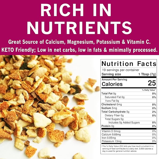 - NATURAL, BENEFICIAL & HIGH IN NUTRIENTS: As an effective nutritional supplement and aromatic spice, the origin of our orange peel is Spain. It is very low in calories while having a high amount of Fiber, Vitamin C, and D-limonene. Additionally, Contains essential minerals including Calcium, Potassium & Magnesium. Supports Immune System and Heart. You can use our natural orange peel for your skin.