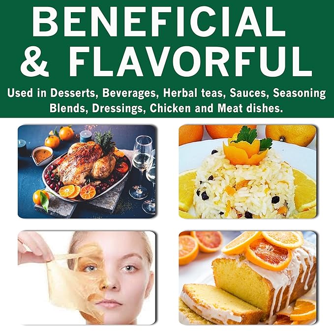 - PREMIUM QUALITY ORANGE PEEL: Spices Village has a dehydrated, cut & sifted orange peel. It is also known as orange rind or citrus fruit zest alongside grapefruits, mandarin, limes or lemon zest, and is used for cooking, baking and brewing tea. Organically used in desserts, beverages, herbal teas, sauces, seasoning blends, dressings, chicken and meat dishes. Can be mixed with our orange peel with the orange extract for baking.