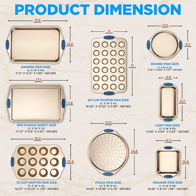 - 10-PIECE SET: The 10-Piece Baking Pan Set offers complete high quality kitchenware for baking cake, loaf or muffins. Includes baking pan, pizza pan, small/big cookie sheet, 2 round pans, square pan, loaf pan, and 12-cup & 24-cup muffin pans