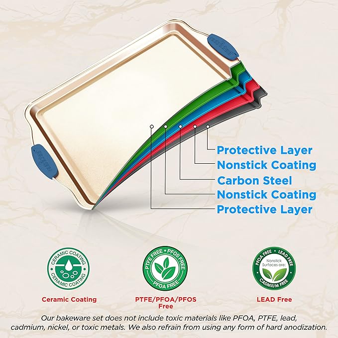 - HEATPROOF SILICONE HANDLES: The commercial grade restaurant quality kitchen bakeware features blue silicone handles to prevent accidental burns. Also stain-resistant, easy to clean & dishwasher safe but hand washing is recommended to extend pan life
