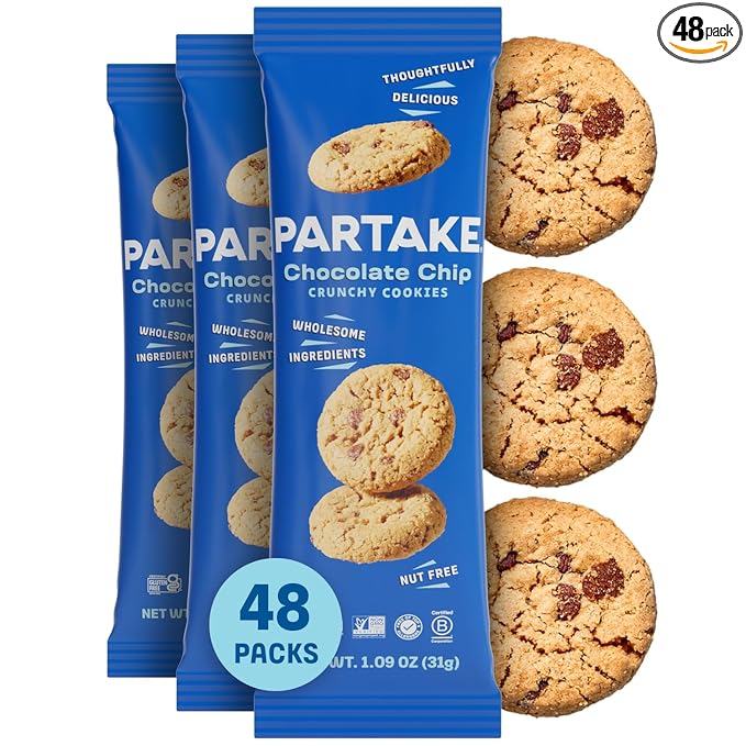 Partake Gluten Free Crunchy Chocolate Chip Cookies - Vegan - Free From the Top 9 Allergens Including Dairy, Wheat, Soy, Eggs, & Peanuts - Safe School & Office Snack (48 Packs, 1.09 oz)