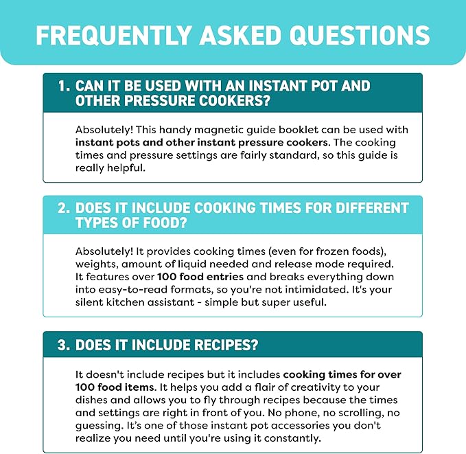 - Master Your Instant Pot with Must-Have Instant Pot Accessories. Featuring a magnetic instant pot cooking cheat sheet booklet loaded with over 100 food entries. This pressure cooker accessory is organized into 6 food categories with precise cooking times, pressure levels, and tips. Designed for all instant pot pressure cooker models, it's a must-have kitchen tool for home cooks seeking speed, accuracy, and flavor.