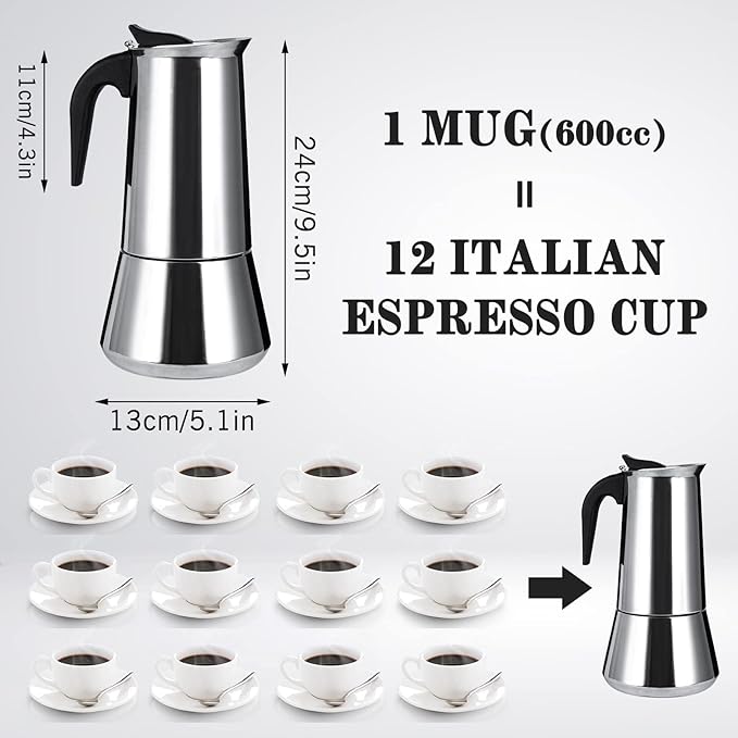 Stainless Steel Stovetop Moka Pot Espresso Maker Percolator 12 Cup 600ml Portable Italian Greca Cuban Coffee Maker for Big Family Home Office Camping, Work with Gas Electric Ceramic Stovetop