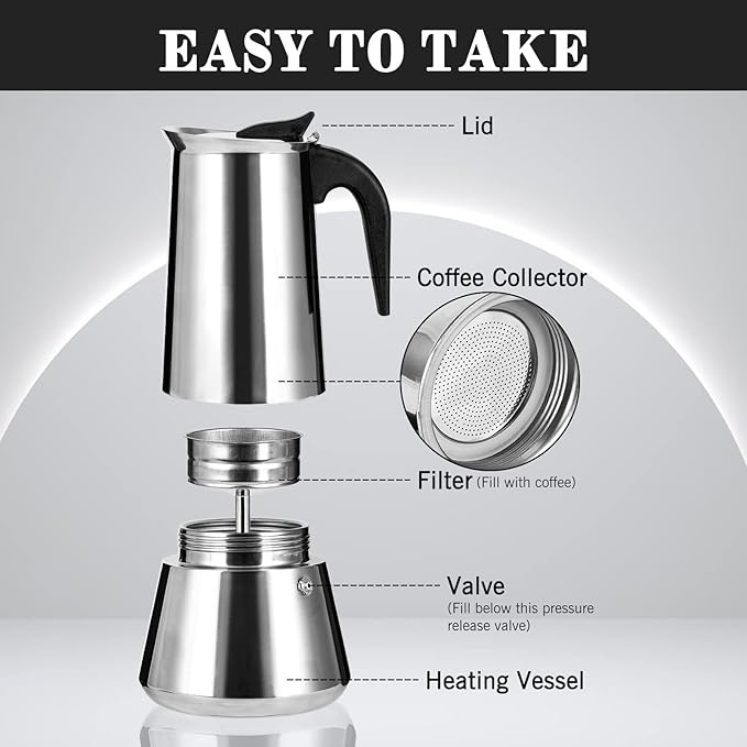 - Evenly heated: The mocha coffee pot uses advanced heating technology to ensure that the coffee is evenly heated during the brewing process, releasing the maximum aroma and taste. Whether it is starting a new day in the morning or taking a break in the afternoon, you can enjoy a cup of mellow coffee.