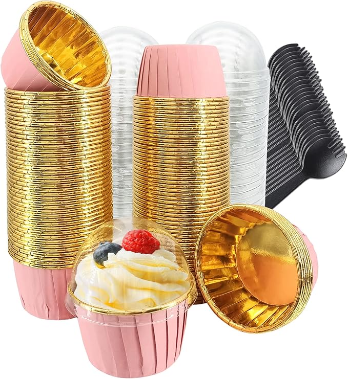Cupcake Liners for Baking 100Pack,Free-Air 3.5Oz Foil Baking Cups with Dome Lids,Disposable Muffin Tins Muffin Cups for Wedding Birthday Party, with Spoons-Pink in gold