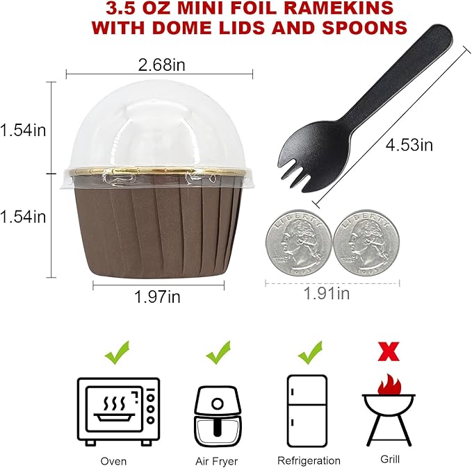 - 【Cute Mini Baking Cups】- These muffin cups size: 2.7"D x 1.6"H;The matching clear lid height 1.6",The cupcake cups hold about 3.5 oz food capacity. The dome cover is great for icing sugar and sprinkles.Ideal holders for cupcake muffin ramekins,mini pie, small cake,souffle, pudding, and much more.