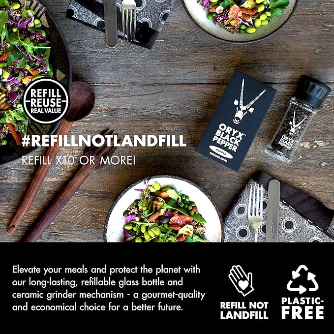 - Refill, Reuse, Real Value: A stylish addition to any restaurant or dining table. Oryx glass bottles are easy to clean, have a ceramic grinding mechanism and can be refilled more than 10 times with Oryx Whole Black Pepper Refill Boxes. #RefillNotLandfill