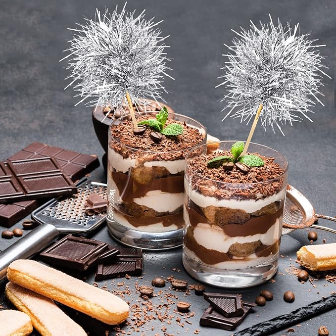 Chinco 100 Pcs Foil Firework Cupcake Toppers Sparkle Tinsel Cake Toppers Cake Decoration Cocktail Fruit Toothpick for Birthday Wedding Graduation Party(Silver)