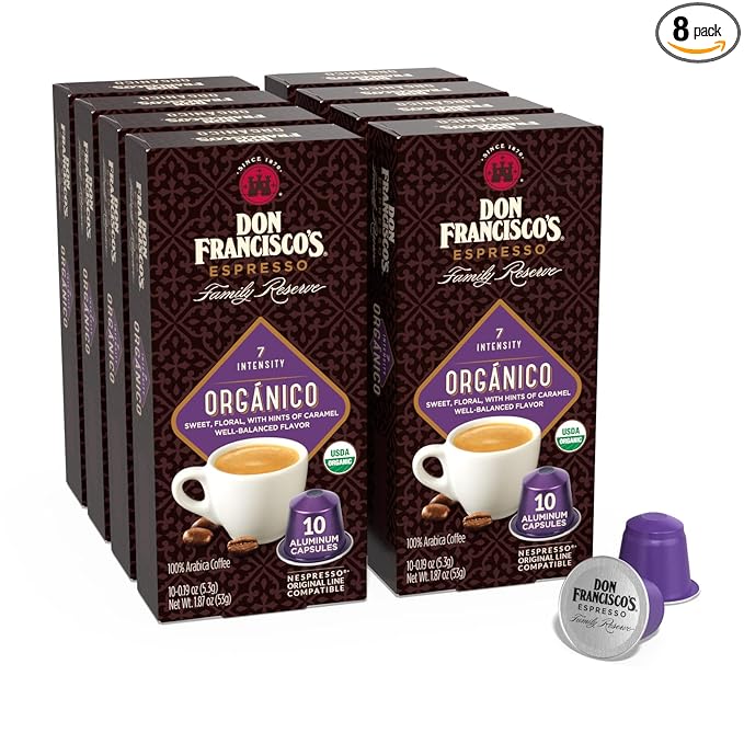 Don Francisco's Organico Espresso Pods: 80 Dark Roast Aluminum Capsules, Intensity 7, Compatible with Nespresso Original Line Machines - Bold Cuban-Style coffee with Caramel Notes