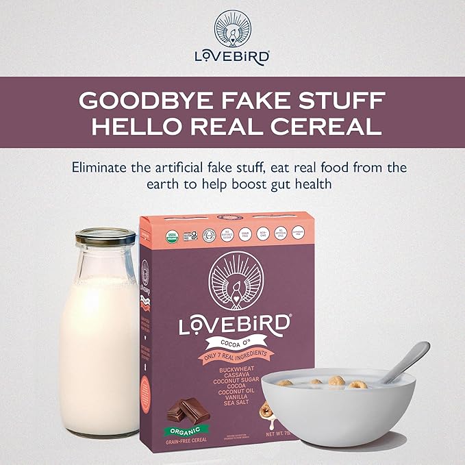 - Healthy Cereal Made with 100% Real Food, NO fake stuff. Lovebird Cereal is made with 7 real ingredients packed with prebiotic fiber and complete protein. Always organic, grain free, gluten free, dairy free, non-GMO, and no refined sugars or artificial flavors—just clean, whole food ingredients for a satisfying and naturally sweet crunch.