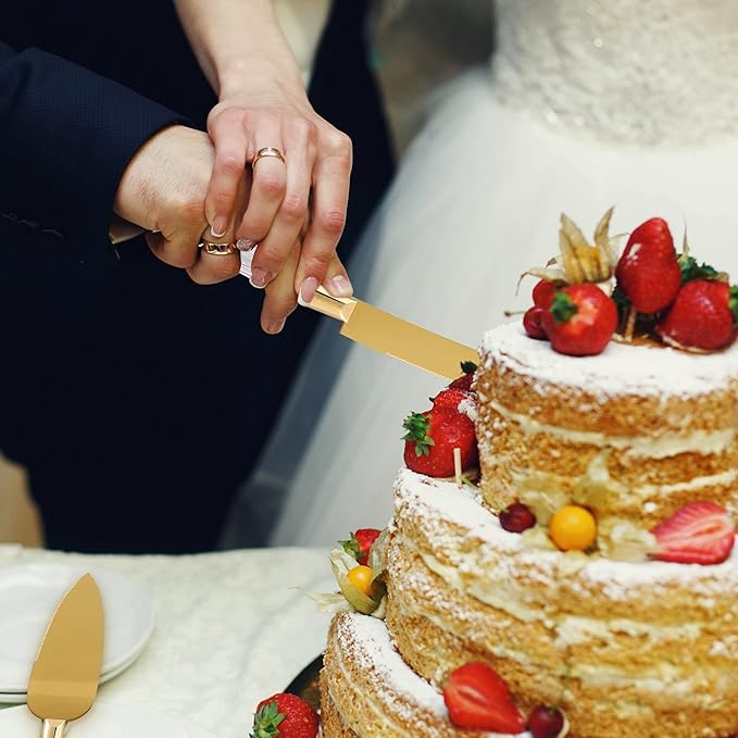 - 🍴 STURDY AND VERSATILE: This set of tools is not only useful for cutting and serving cakes, pastries, pizzas, pies, and other treats at weddings and other indoor and outdoor events, but it also doubles as a wedding cake knife and server set. The kitchen and house can also make use of it. From classic and traditional to modern and contemporary, the subtle beauty of our Gold Cake Knife and Server Set goes well with many different types of décors.