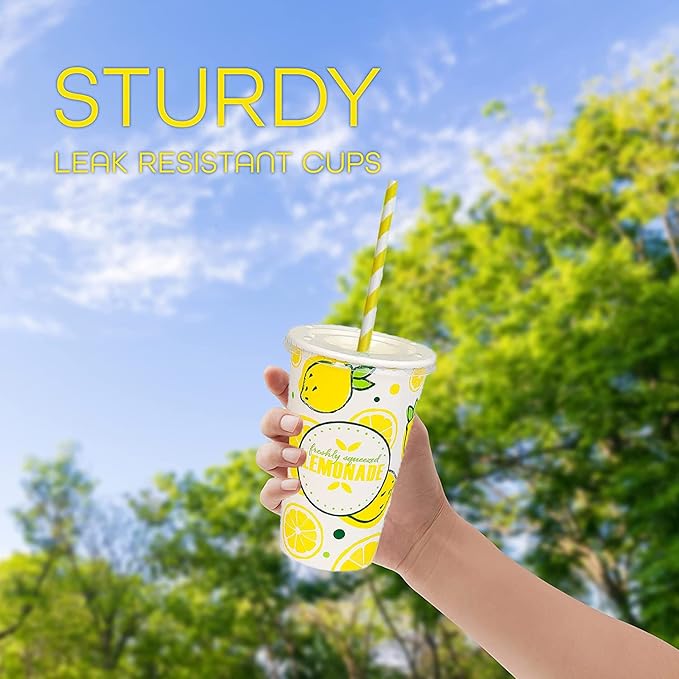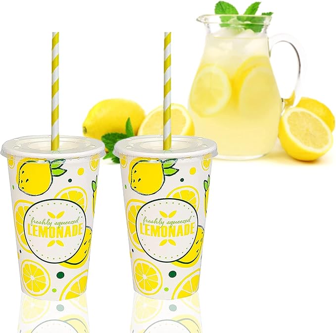 150 Pieces / 50 Sets 20 Oz Lemonade Cups with Lids and Paper Straws - Set of 50 - Lemonade Stand Supplies For Kids and Adults