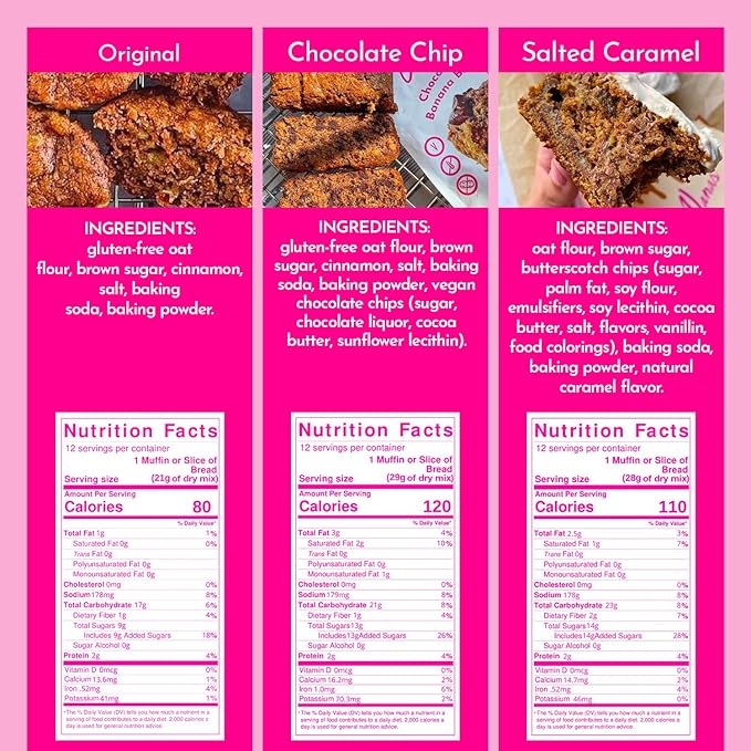 - VARIETY PACK OF THREE FLAVORS. This 3-pack includes our Original, Chocolate Chip, and Salted Caramel banana bread mix. Each flavor is tasty enough to satisfy dessert cravings, but healthy enough to enjoy for breakfast!