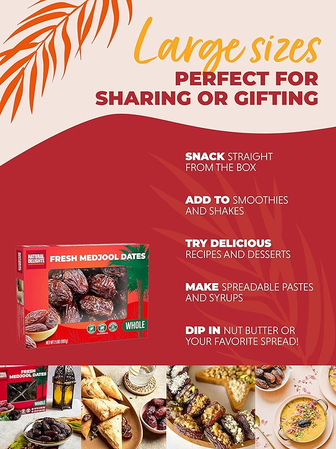 Natural Delights Dates – Large & Plump, Non-GMO Verified, Good Source of Fiber, Naturally Sweet Fruit Snack, Perfect for On-the-Go - Medjool Dates Whole, 2 lb Box