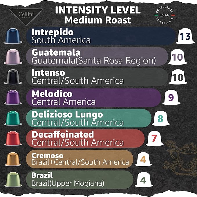 - CREMOSO MEDIUM INTENSITY: Blend of our best selection of Brazilian Central and South American 100% Arabica medium roast coffee beans. Contains 30 single aluminum capsules. All our blends are roasted and packaged in Italy since 1946.
