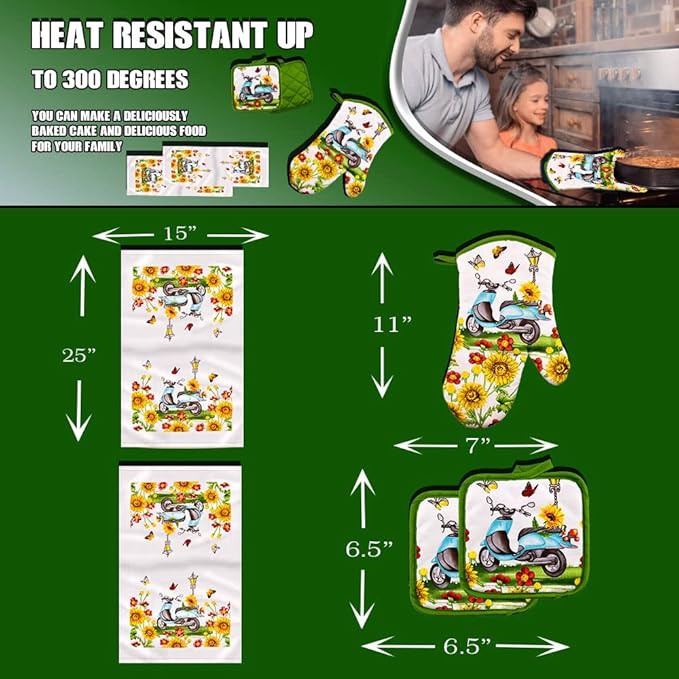 Lobyn Value Packs - Sunflowers & Butterflies & Blue Scooter: 5 Piece Kitchen Towel Set with 2 Decorative Dish Towels (25x15), 1 Oven Mitt and 2 Potholders (6 1/2 Sq)