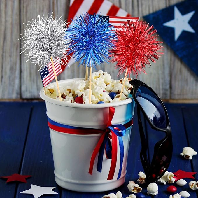 - Large quantity: the package includes 100 pieces of firework tinsel picks of 3 different colors, 33 for silver, 33 for red and 34 for blue, sufficient quantity and various colors to meet your needs on cake decorations