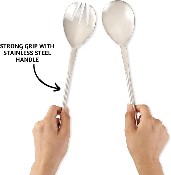- UNIQUE DESIGN - The salad tongs or serving set have ergonomically designed wide handles that makes for a comfort grip. It is heat resistant and stays cool while cooking, serving or mixing. The shape of these serving spoons and salad forks make them ideal for large salad bowls or serving bowls.