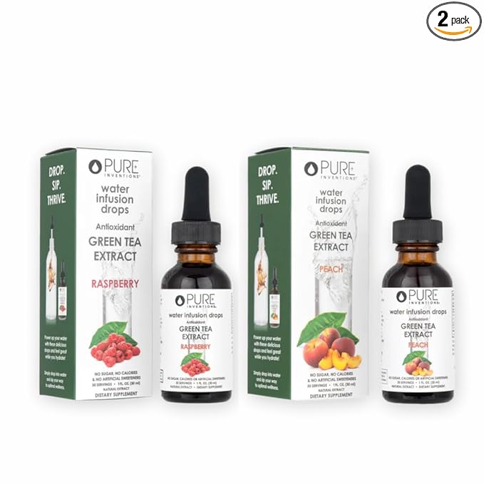 Pure Inventions - Green Tea Raspberry & Peach Water Infusion Drops -Antioxidants & Electrolytes -Health & Wellness -Immune Support -Sugar Free, Zero Calorie, No Artificial Sweeteners -30 Servings Each
