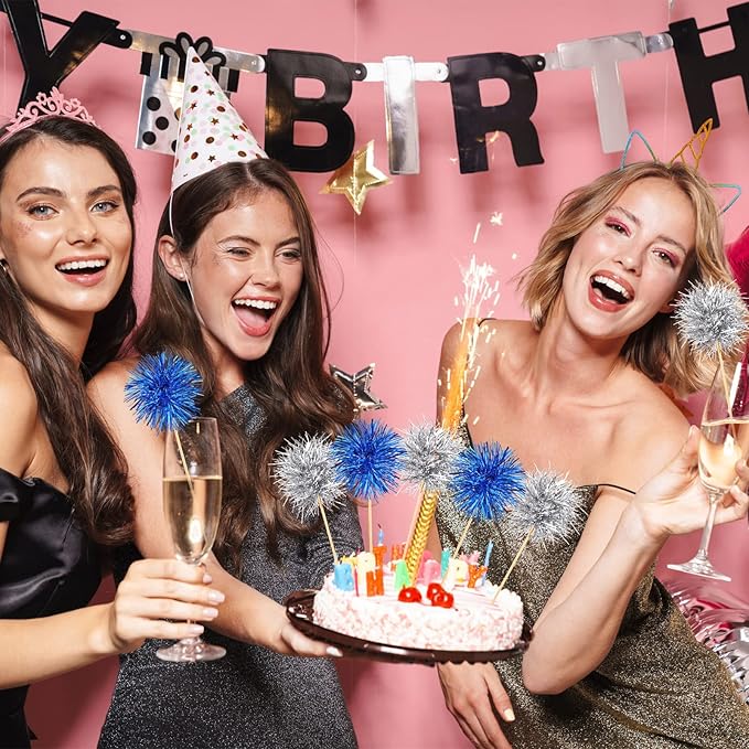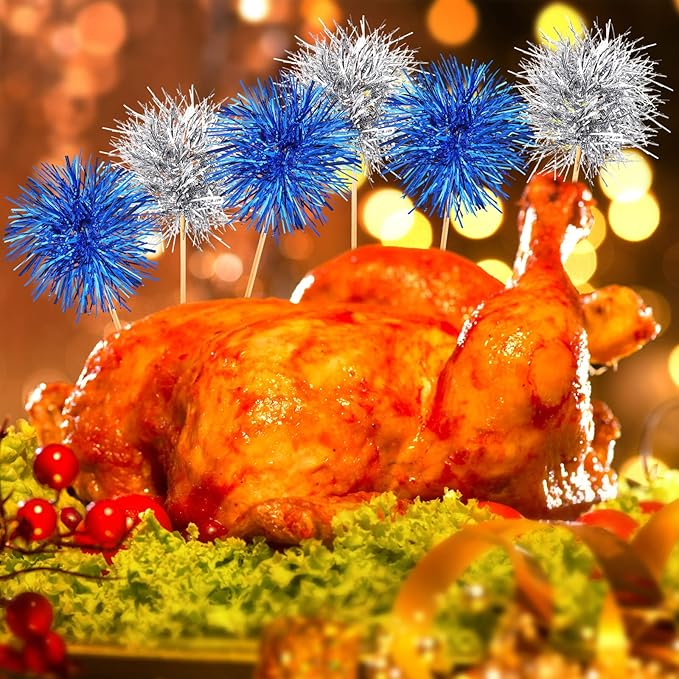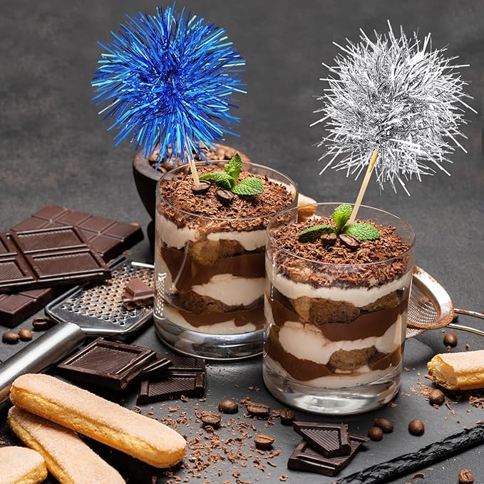 Chinco 100 Pcs Foil Firework Cupcake Toppers Sparkle Tinsel Cake Toppers Cake Decoration Cocktail Fruit Toothpick for Birthday Wedding Graduation Party(Silver, Blue)