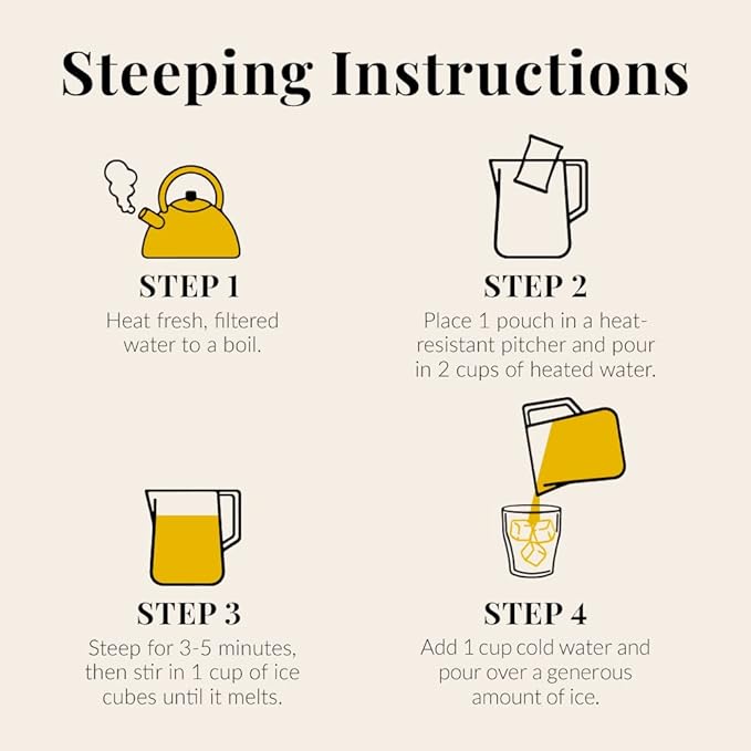 - STEEPING INSTRUCTIONS: Place one pouch with 2 cups of just short of boiling water in a heat-safe pitcher. Steep for 3-5 minutes. Remove pouch then stir in one heaping cup of ice until ice melts. Add one more cup of cold water and serve over more ice.