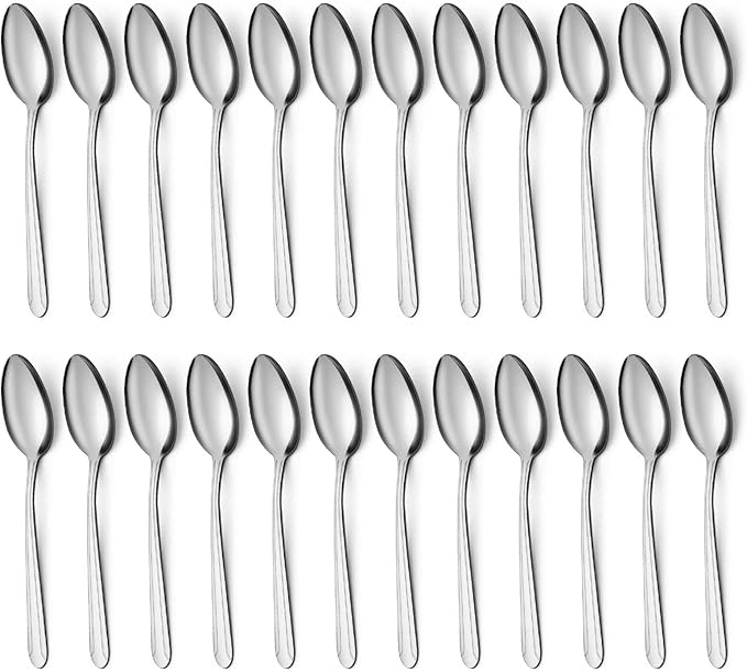 - 【ERGONOMIC & DISHWASHER SAFE】 The 24 Pieces stainless steel tea spoons are ergonomic design, mirror polished. The curvature of our round handle is designed according to the posture of the hand, and the edge of teaspoons are smooth that they won't hurt you. Besides, these small coffee spoons are carefully weighted to be comfortable to hold