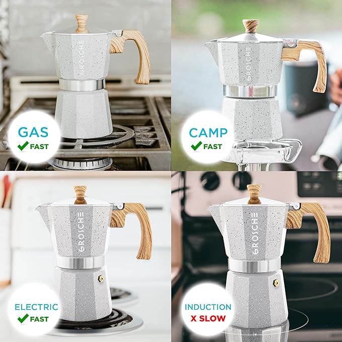 - ⭐ [ Easy to use Moka Espresso coffee Maker ] works on gas and electric stove top and propane camping stoves as well. NOT suitable for Induction Stoves. It is a type of easy to use stovetop espresso maker, coffee perculator, or expresso coffee maker stovetop. Its also called a Moka pot, Moka coffe maker, or Cafetera Cubana.