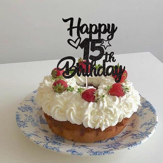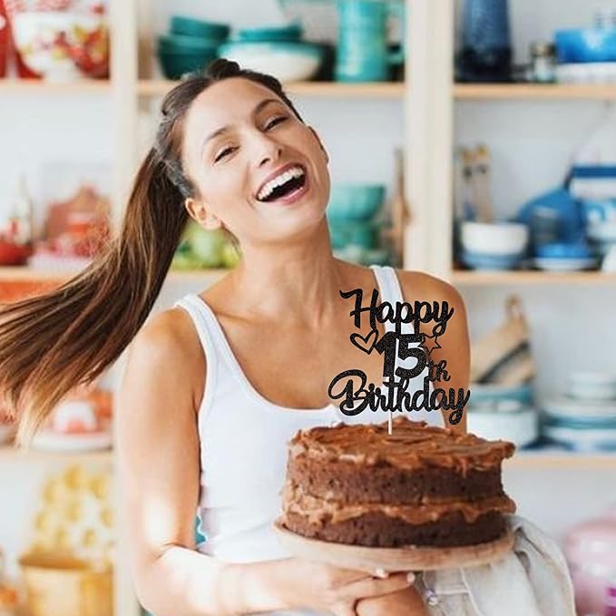 1 Pack Happy 15th Birthday Cake Topper Glitter Heart Star 15 Fabulous Cake Pick Birthday Sign Cake Decorations for Children 15th Birthday Theme Party Supplies Black