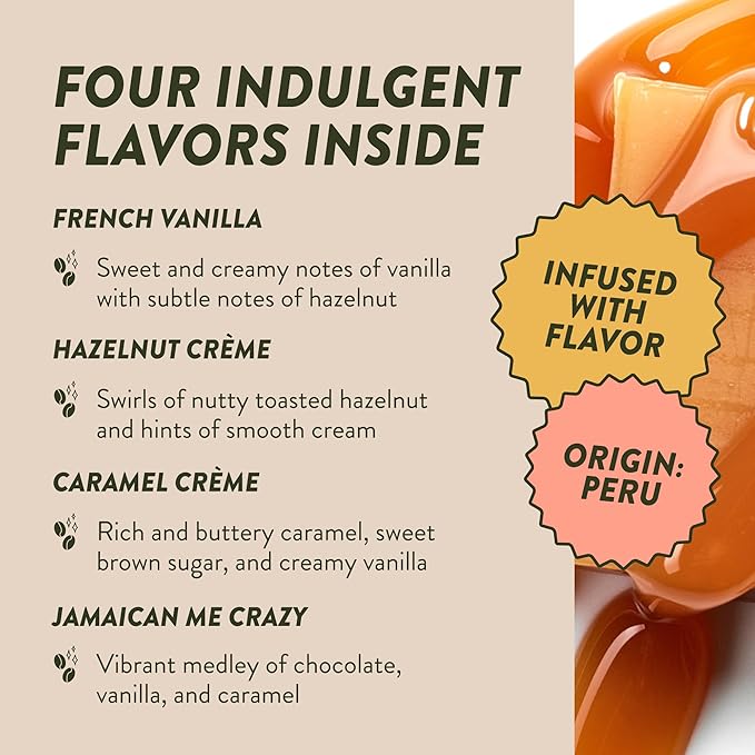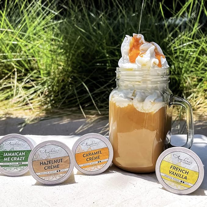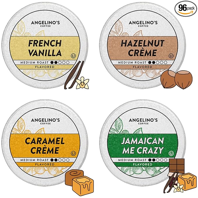 - INCLUDES: Angelino's Flavored Variety brings you 96 single serving Keurig K-Cup compatible pods. Inside are four 24ct boxes: French Vanilla, Hazelnut Crème, Caramel Crème, Jamaican Me Crazy.