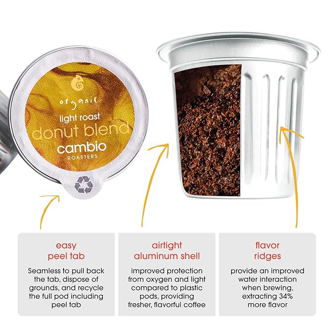 - Flavor Ridges: Each aluminum coffee k cup is designed with Flavor Ridges that provide more surface area for Cambio Coffee grounds, promoting more thorough water interaction during brewing. This optimized coffee pod design extracts 34% more flavor compared to standard pods.