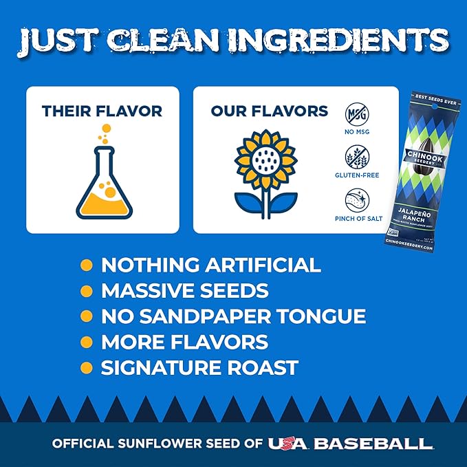 - GREAT FOR GROUP & SOLO EATING: Ideal for baseball, road trips, camping, fishing, hunting, disc golf, & softball. No matter what your adventure, having a bag of Chinook nearby keeps you fueled for success. There's just something about cracking and spitting seeds that put you in a winning mindset. The official sunflower seed of USA Baseball and partnered with Bobby Witt Jr. of the Kansas City Royals, it’s also a perfect snack to have in the dugout at your next baseball game.