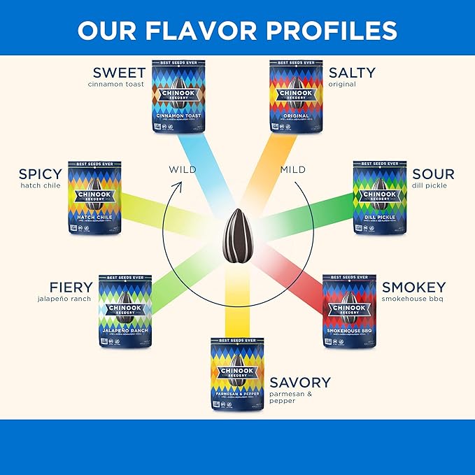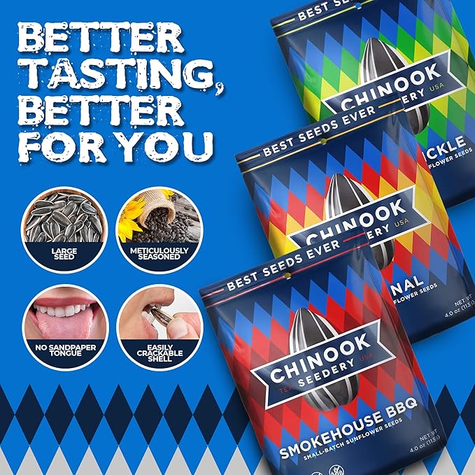 - PRIME CHINOOK SEEDERY: Sunflower seeds are so naturally healthy – full of vitamins, minerals, and healthy fats, Chinook Seedery added a twist to this good snack and created the best-flavored sunflower seeds ever! Want a new kind of seeding experience? Get the best bucket of seeds ever now! For a perfect day out in the sun, either in the yard or on the baseball field, you'll enjoy our Lawnmower Variety Pack which includes our Dill Pickle, Smokehouse BBQ, and Original flavors!