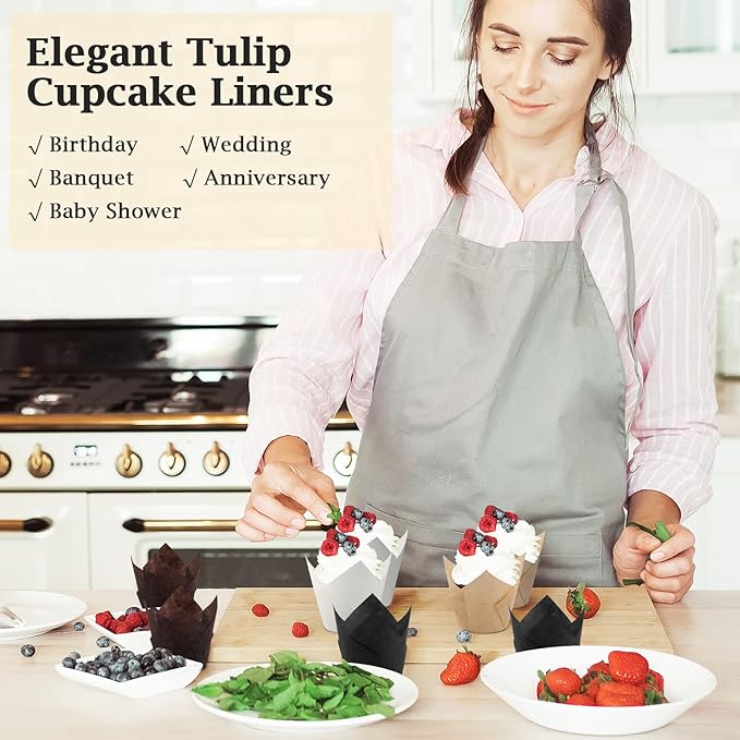 - Value pack: each set comes with 200 mini tulip cupcake liners, in 4 different colors, brown, white, natural, and black, each color of 50 pieces, sufficient for both daily home or dessert shops use and change, ideal for baking, lunch or snack cups, and more