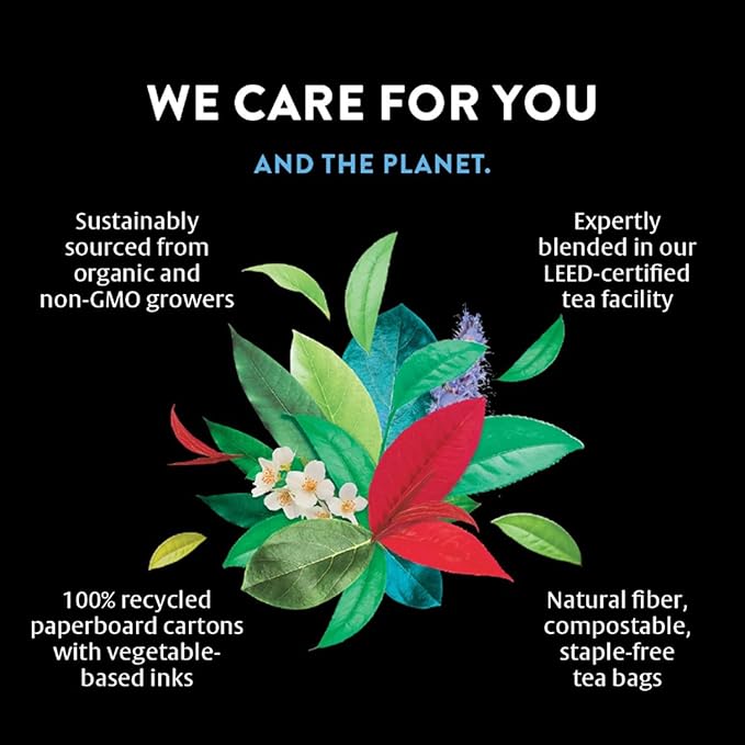 - We Choose to Care for the Planet: Proud to be a B Corp*, our organic teas are individually packaged in natural fiber, compostable tea bags and then packed into cartons made from 100% recycled paperboard. Our teas are expertly blended in our LEED-certified tea facility.