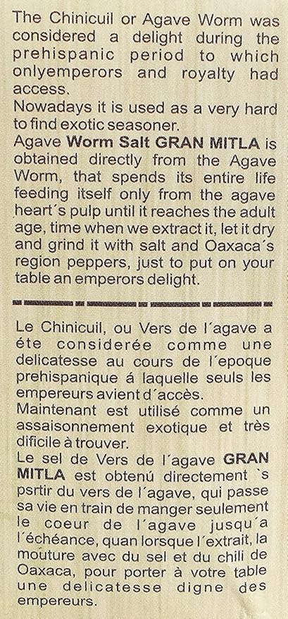 - Gran Mitla's grasshopper salt is made from a prehistoric receipe. Adult dried and toasted red grasshoppers ground with Oaxacan chilies and sea foam salt with a hint of lemon