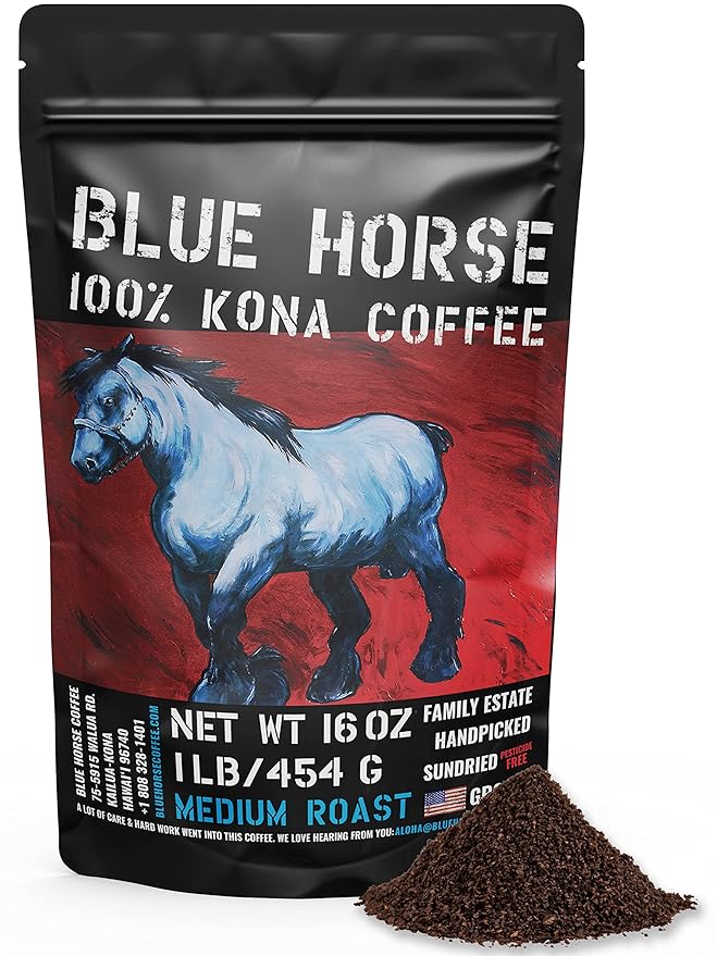 Blue Horse 100% Kona Coffee (Ground), Medium Roast Arabica coffee, 16 oz (1 lb) Bag, Farm Fresh, Authentic Hawaiian Coffee from the Big Island, Smooth & Bold Flavor, Hand-Picked & Sun-Dried for Rich Aroma