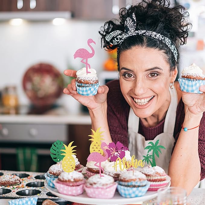 24 Pack Tropical Cupcake Toppers Aloha Luau Cupcake Picks Glitter Flamingo Plam Leaves Pineapple Cupcake Decorations for Summer Baby Shower Birthday Wedding Party Cake Supplies