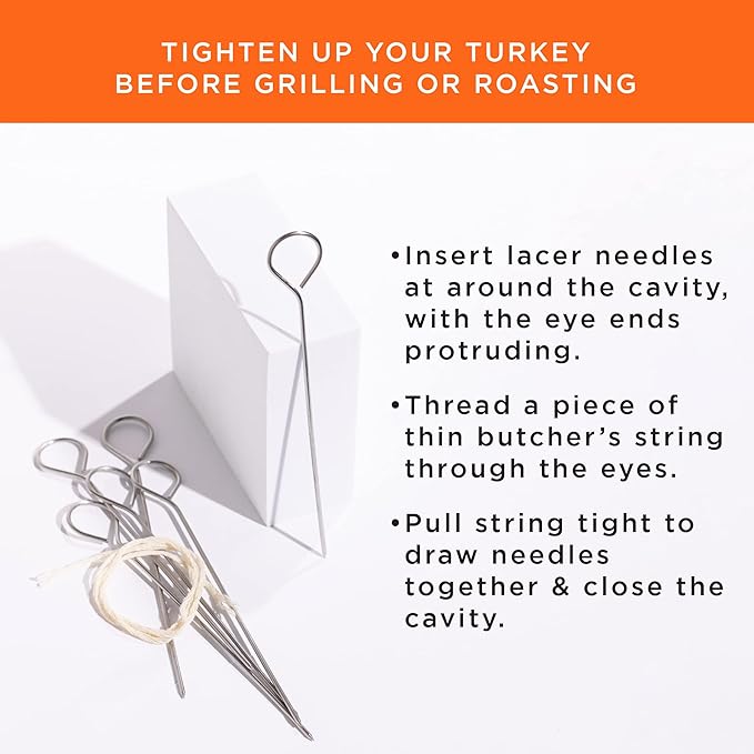 - PERFECT POULTRY ACCESSORY: Includes 6 reusable stainless steel pins and single-use, 100-percent cotton and disposable butcher’s twine to hold your poultry, meat, and fish in place while roasting and cooking.